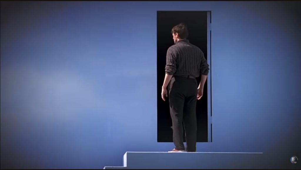 Truman llegó al final del recorrido y sube una escalera en cuya cima se encuentra con una puerta. Pero inmediatamente una voz viene del cielo: su creador le habla.